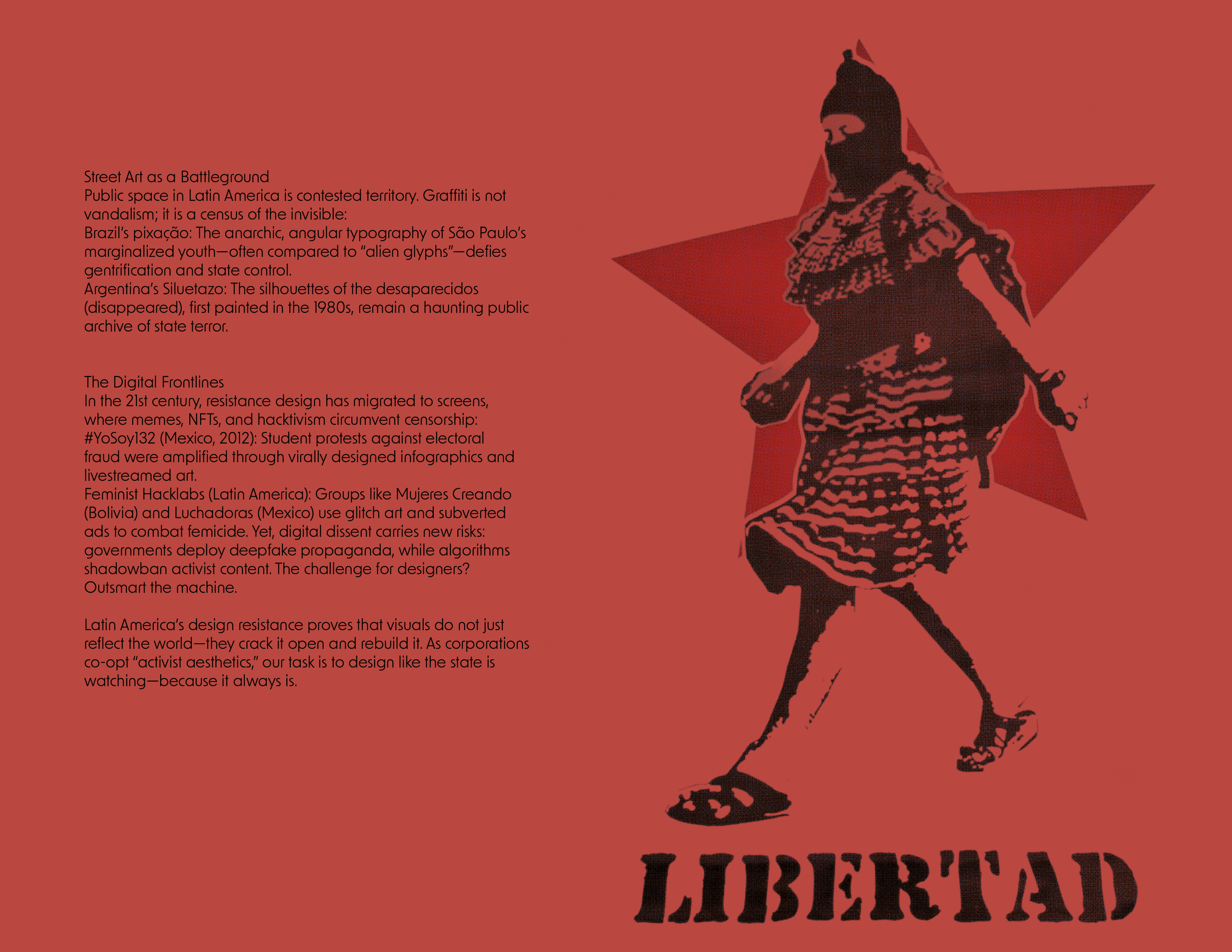Students will explore how designers, artists, and movements have turned everyday materials—ink, pixels, street walls, and textiles—into potent acts of defiance. We will trace this lineage from the woodcut prints of Mexican labor movements to the hacked neon signs of Chile’s social uprisings, analyzing how craft, typography, and digital media are weaponized for justice.