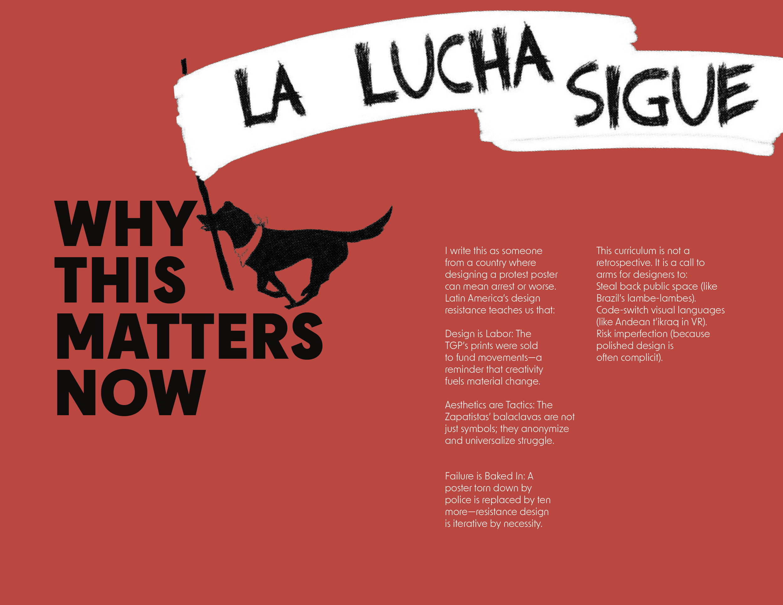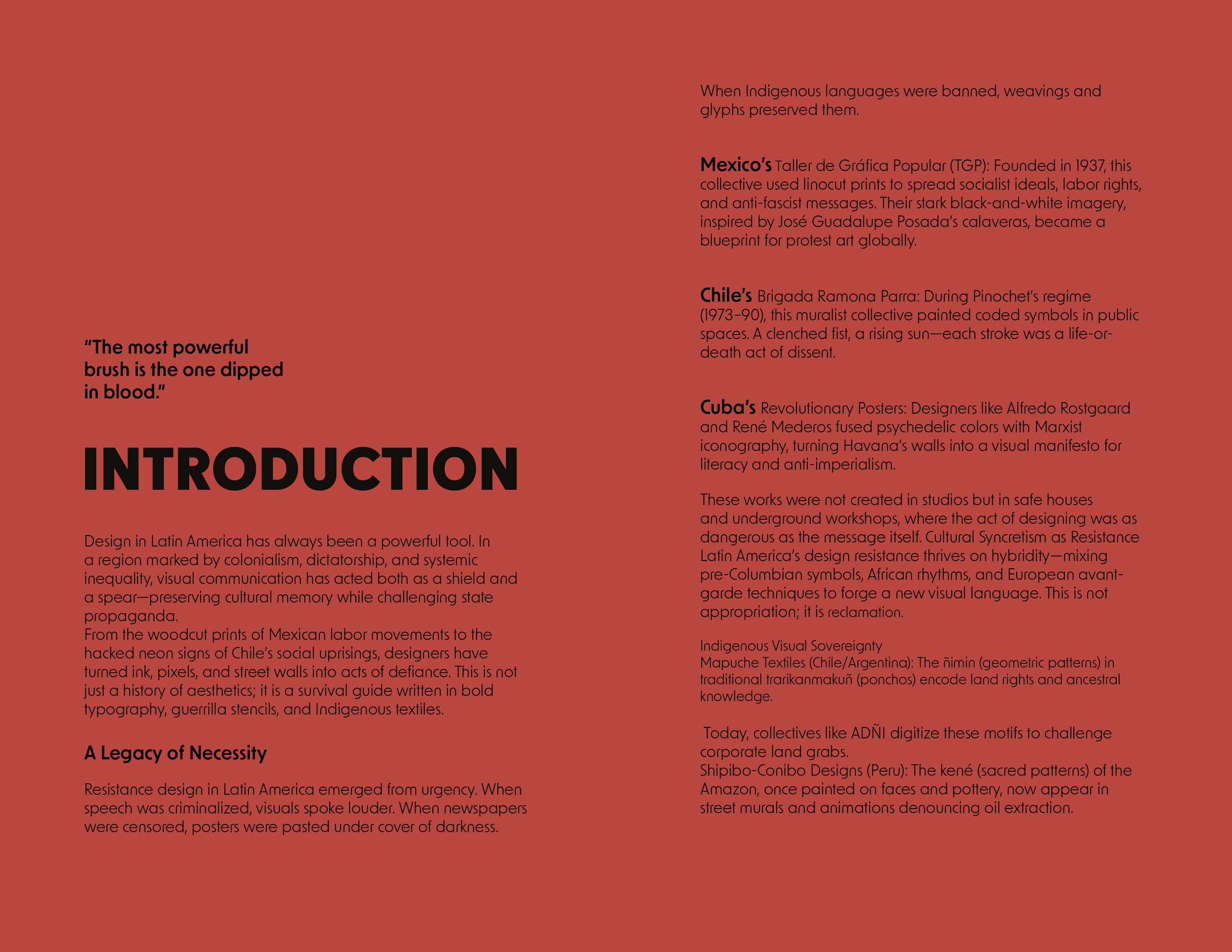 This curriculum reframes the history and practice of design in Latin America, moving beyond aesthetics to examine its vital role as a tool of cultural survival and political action. In a region shaped by colonialism, dictatorship, and systemic inequality, visual communication has never been neutral. It has functioned both as a shield and a spear—preserving vulnerable cultural memory while directly challenging state propaganda and oppressive systems.
